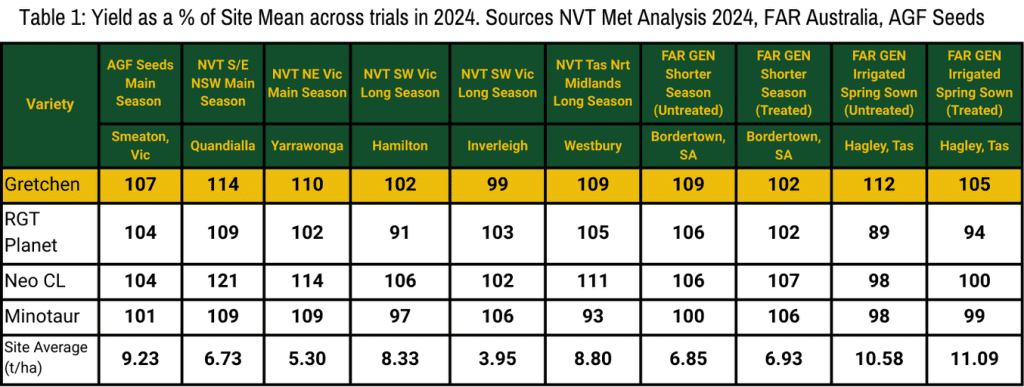 AGF Seeds’s new (available 2026) conventional spring barley, Gretchen has shown 5 to 10% yield improvements over RGT Planet. Gretchen is a mid-late maturity barley with a similar maturity to RGT Planet and offers a sound disease package with strength in Scald resistance and significant improvement in Net Form Net Blotch vs RGT Planet.